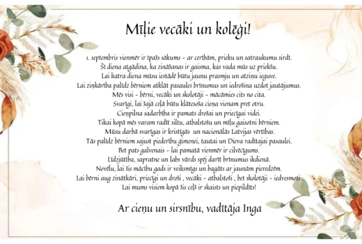 Skolotāju diena atgādina, cik svarīgi ir novērtēt tos, kas māca ne tikai rakstīt un rēķināt, bet arī saprast, piedot, sadarboties un mīlēt. Katrs skolotājs, kas iededz gaismu citā cilvēkā, dara pasauli labāku.